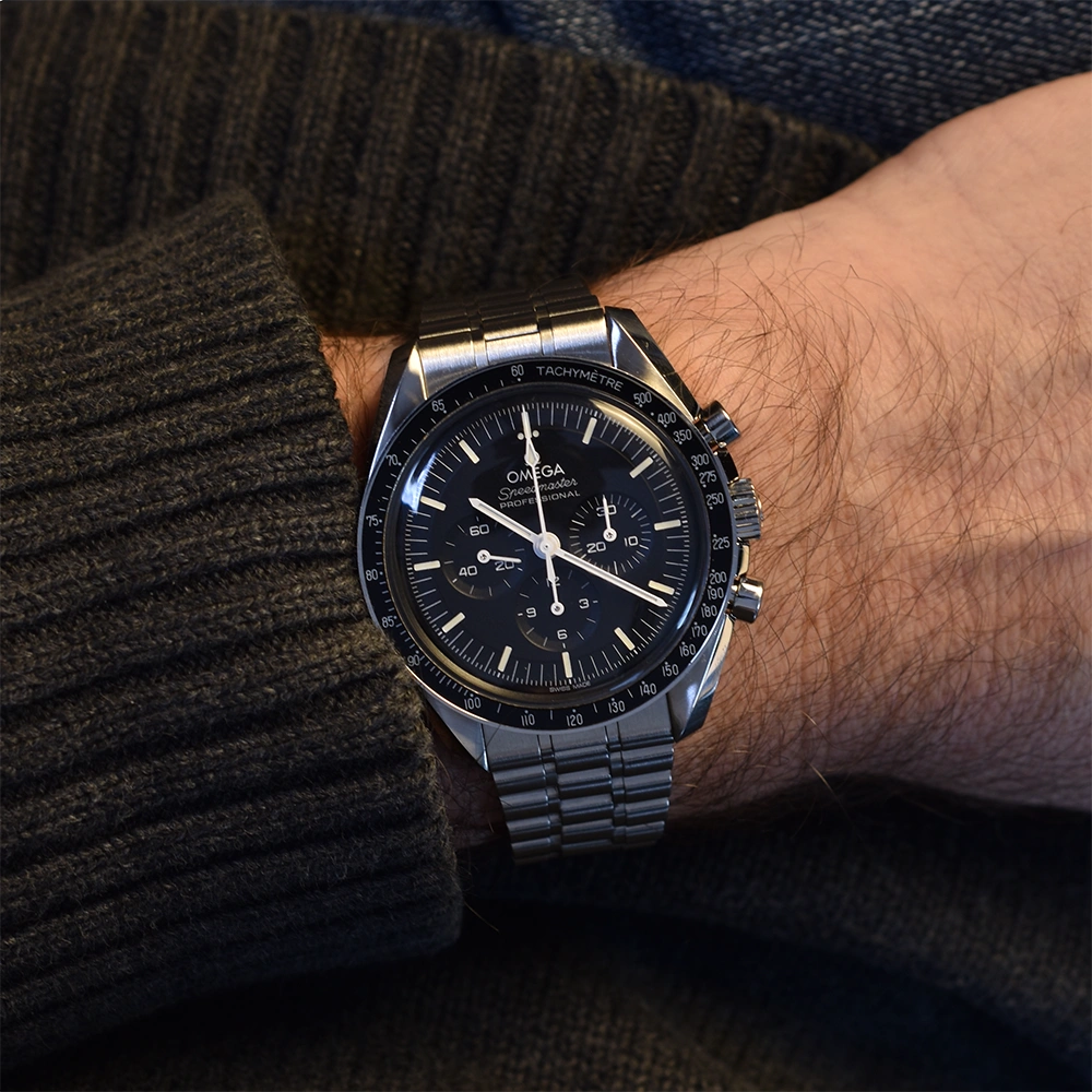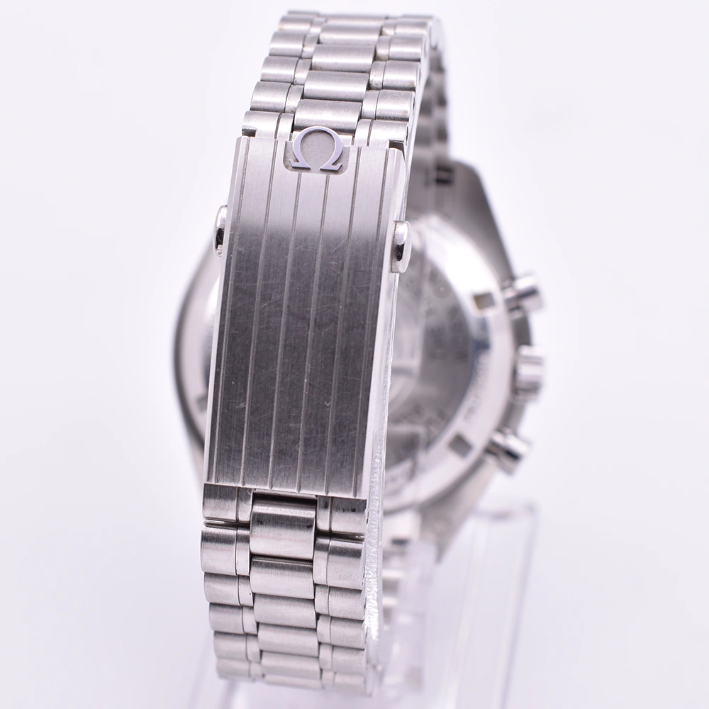 For Sale is an excellent example of the Omega Speedmaster Moonwatch Professional Hesalite, reference 310.30.42.50.01.001. With a RRP of £6,600 this model features a 42mm case with a tachymeter bezel, domed hesalite crystal and black chronograph dial. It's fitted to the upgraded bracelet with the micro-adjustment on the clasp.