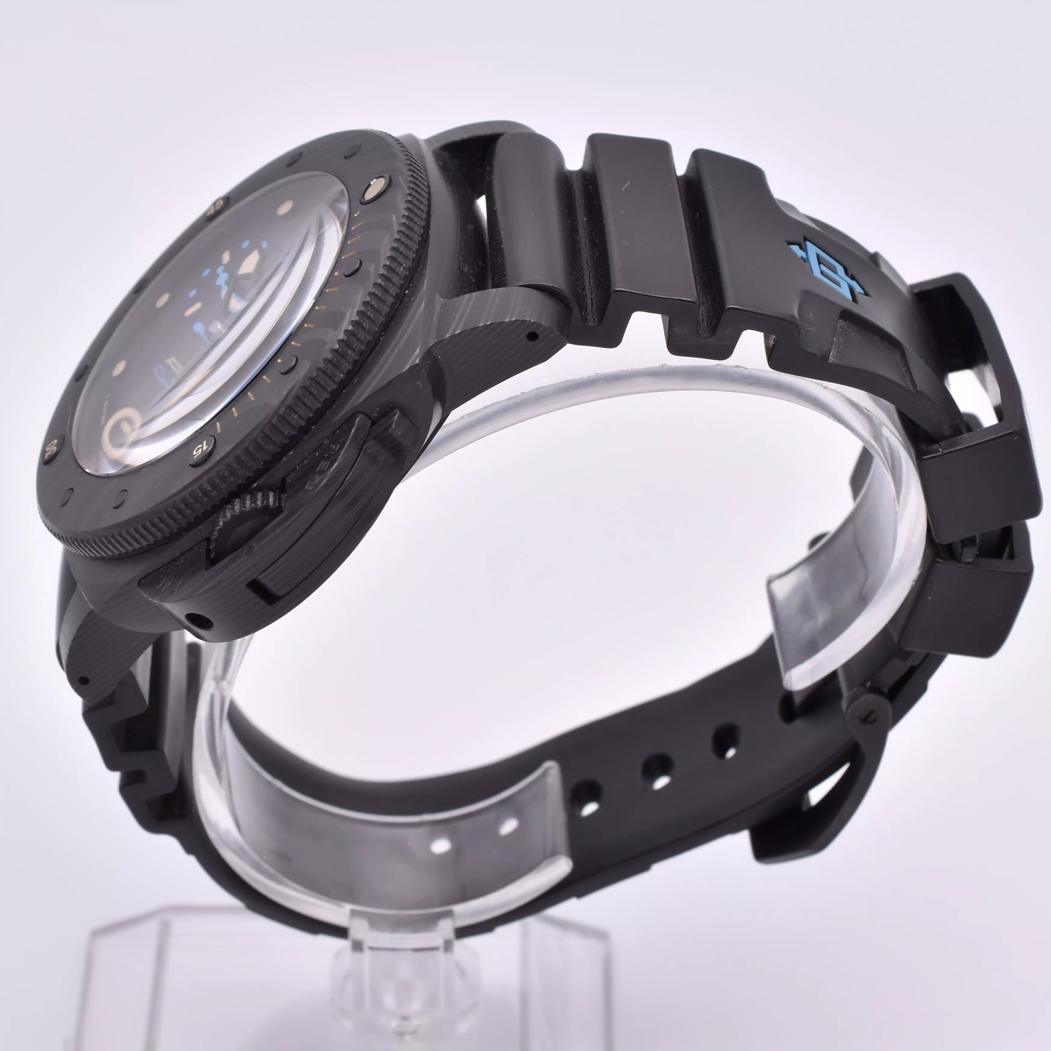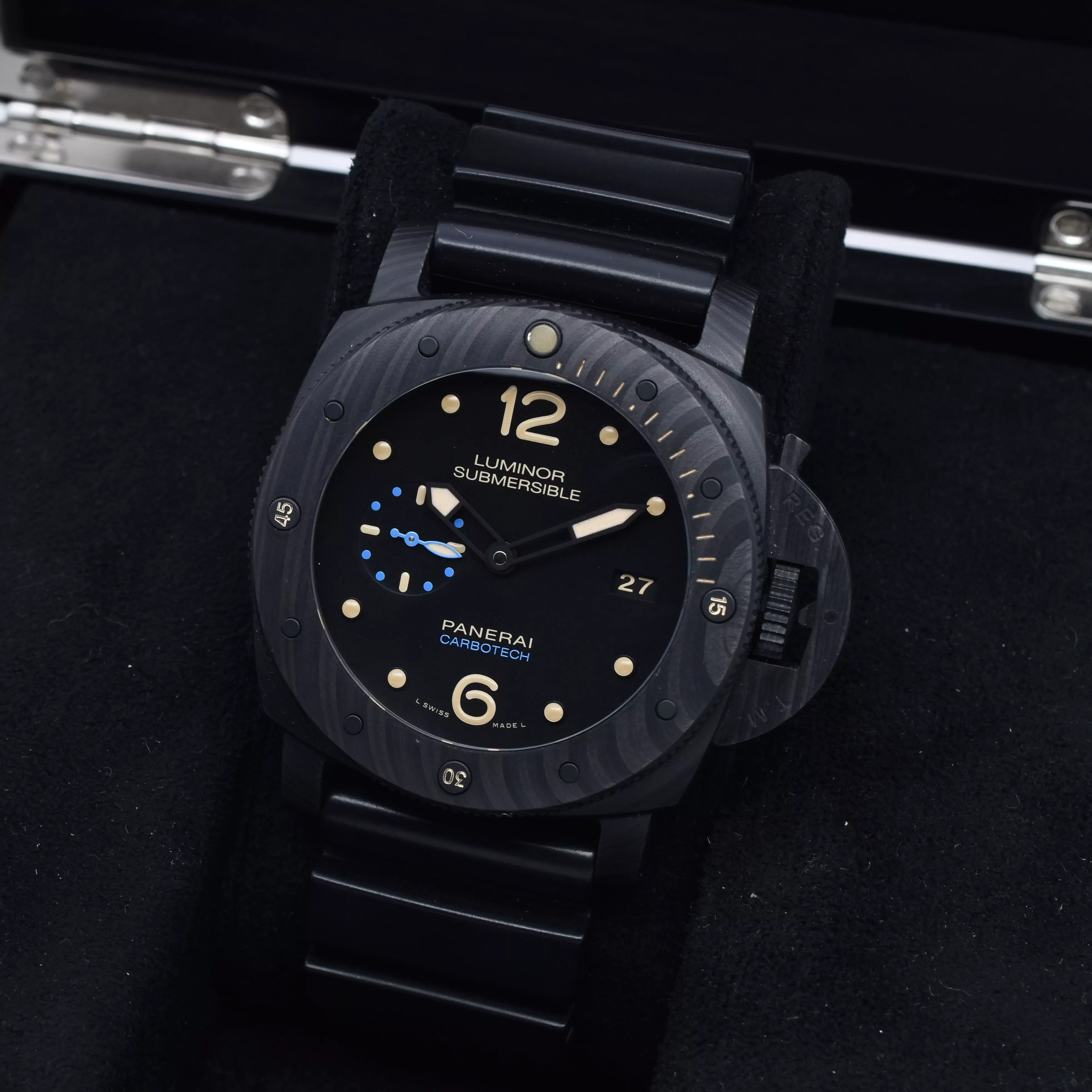 This 47mm Submersible features an innovative carbotech material; a composite structure made of high performing long carbon fibres. Within the black dial are cream luminescent markers with touches of blue throughout.