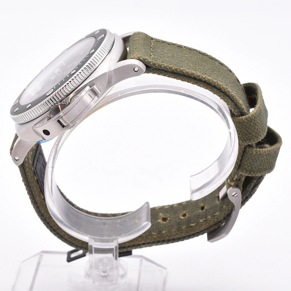 With a RRP of £10,300, this new release in partnership with Marina Militare features a 44mm brushed stainless steel case, a uni-directional green ceramic bezel and a textured green-gradient dial, featuring small-seconds at the 9pm and a date at the 3pm. It's fitted to the OEM green canvas strap with the OEM tang buckle. It has a spare OEM accordian black rubber strap in the box, along with the strap changing tools.
