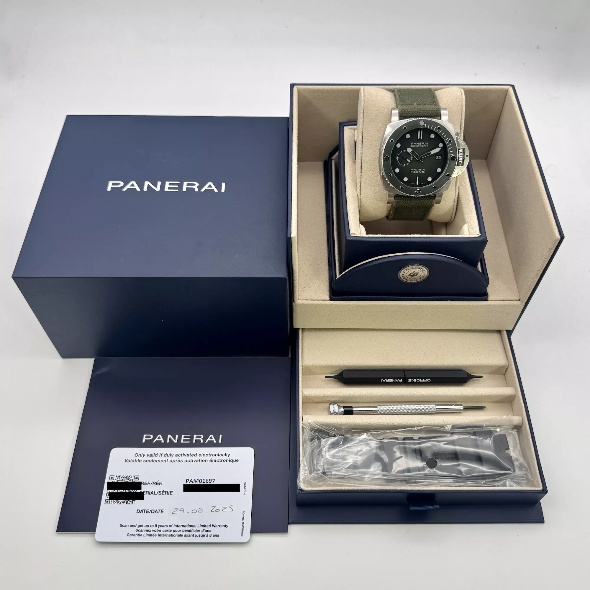 For sale is a brand new example of the Panerai Submersible Marina Militare, reference PAM01697.